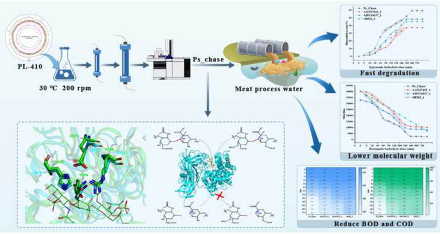 为解决以上问题,研究团队从环境样本中筛选出具有糖胺聚糖降解能力的假节杆菌(Pseudarthrobacter sp. PL-410),并构建出高效、环境友好的裂解酶(Ps_Chase)。研究系统解析了其分子机制并完成工艺验证。结果显示,Ps_Chase对硫酸软骨素的酶解比活力较商业化酶提升50%,可高效裂解硫酸软骨素并生成低聚糖。通过分子动力学与量子/分子力学联合分析,发现该酶依赖H271、R334、Y280等关键残基,通过“两步质子转移”机制实现β-消除反应,从而高效切断糖苷键。中试试验进一步表明,经Ps_Chase处理后,废水BOD/COD指标降低40%,实现了污染物减排与资源回收的协同增效。