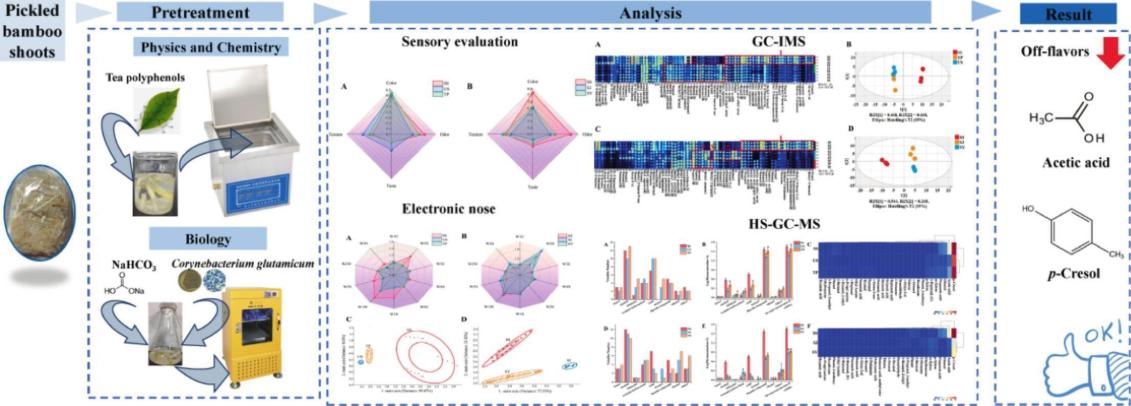 本研究采用超声辅助茶多酚处理、茶多酚单独处理、以及谷氨酸棒杆菌发酵三种策略,结合电子鼻、GC-IMS、GC-MS等多种风味分析手段,系统评估了各处理对酸笋中挥发性化合物、有机酸、pH值及感官品质的影响。结果表明: