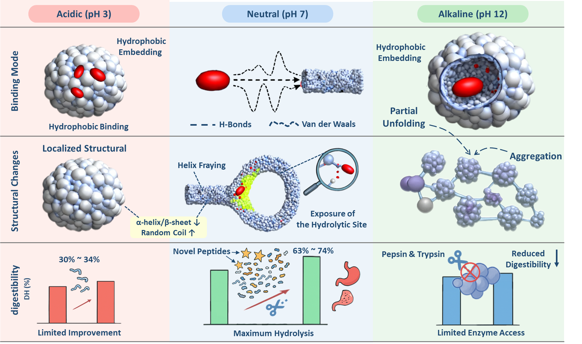 研究发现,番茄红素与肌原纤维蛋白的结合方式具有显著的pH依赖性:在中性条件下,其相互作用主要由氢键和范德华力驱动,而在酸性与碱性环境中则以疏水作用为主。番茄红素的嵌入可诱导肌原纤维蛋白结构性重构但不破坏表面特性,有助于抑制蛋白过度聚集,提高体系的胶体稳定性。番茄红素可显著增强肌原纤维蛋白在中性pH条件下的水解程度和肽段释放水平,其优先结合于富含胰蛋白酶切位点的关键结构区域,通过破坏局部氢键网络,增加酶切位点的可及性,从而促进蛋白水解。该研究从分子互作与结构功能视角,阐明了番茄红素如何通过精细调控蛋白质结构来提升其营养效价,为开发高消化吸收率的营养强化肉制品,提供了理论依据与技术路径。