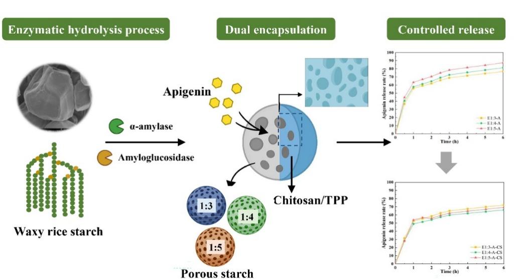 本研究选用α-淀粉酶与淀粉葡糖苷酶的不同配比(1:3、1:4、1:5)及酶解时间对糯米淀粉进行改性,以构建适合包埋芹菜素的多孔载体。结构表征表明,酶解处理显著改变了糯米淀粉的分支链长分布,降低了分子量,并提高了其水油吸附能力。不同酶解条件下的样品呈现出差异化特性:1:4-8h的处理能最佳保留糯米淀粉的结构完整性,而1:3-8h的处理则使糯米淀粉形成最发达的孔结构,且实现了最高的初步包埋效率。经壳聚糖/三聚磷酸钠二次包埋后,1:3-8h处理组在体外消化过程中表现出了最理想的持续释放行为。与原始淀粉相比,双层包埋系统显著提高了包埋效率(最高可达84%)和热稳定性,且在胃部条件下提供强有力的保护,并实现可控的肠道释放。该研究阐明了酶解改性糯米淀粉在芹菜素递送系统中的结构优化与包埋效率之间的关系,为提高疏水性生物活性物质的稳定性和生物利用度提供了科学依据。