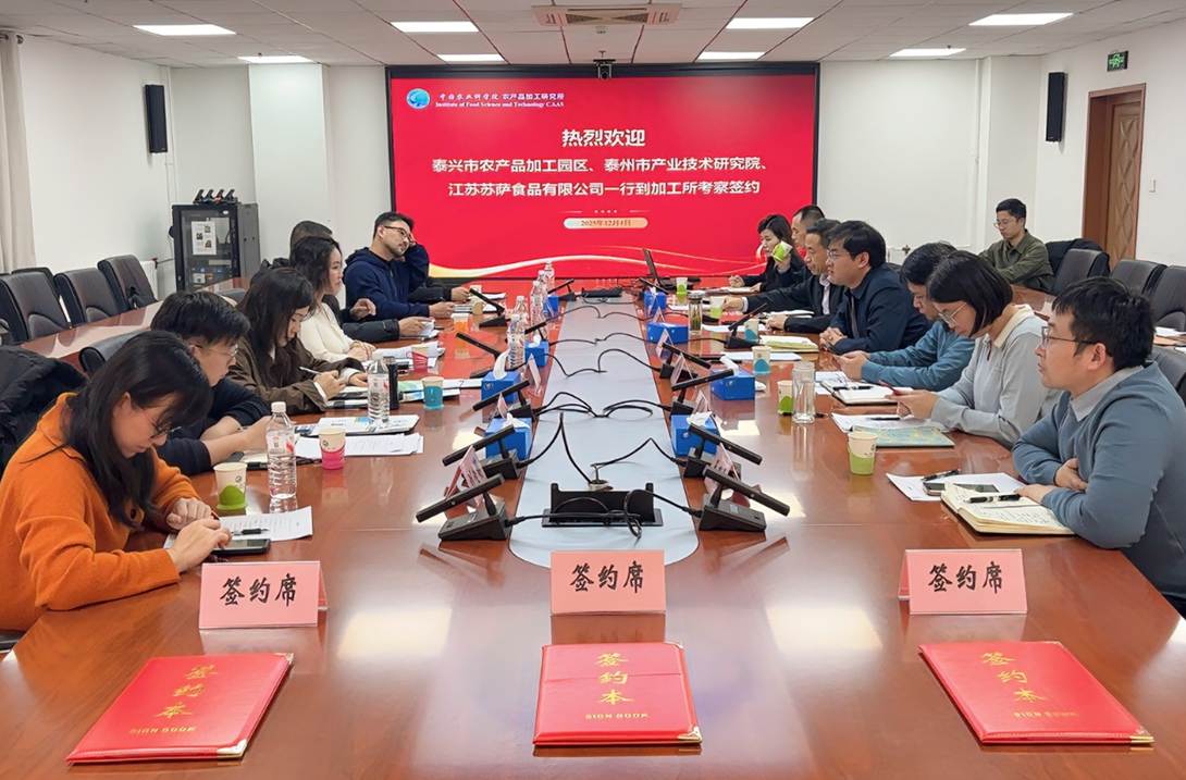 近日,加工所与江苏苏萨食品有限公司、中国(泰兴)农产品未来加工创新研究院签署三方合作协议。加工所副所长王海峰、果蔬加工智造与营养健康创新团队首席科学家毕金峰,江苏苏萨食品有限公司总经理邓宝华,泰兴市农产品加工园区管理办公室副主任鞠晶,泰州市产业技术研究院事业部副主任严家文,中国(泰兴)农产品未来加工创新研究院副院长刘佳萌等共同见证签约。