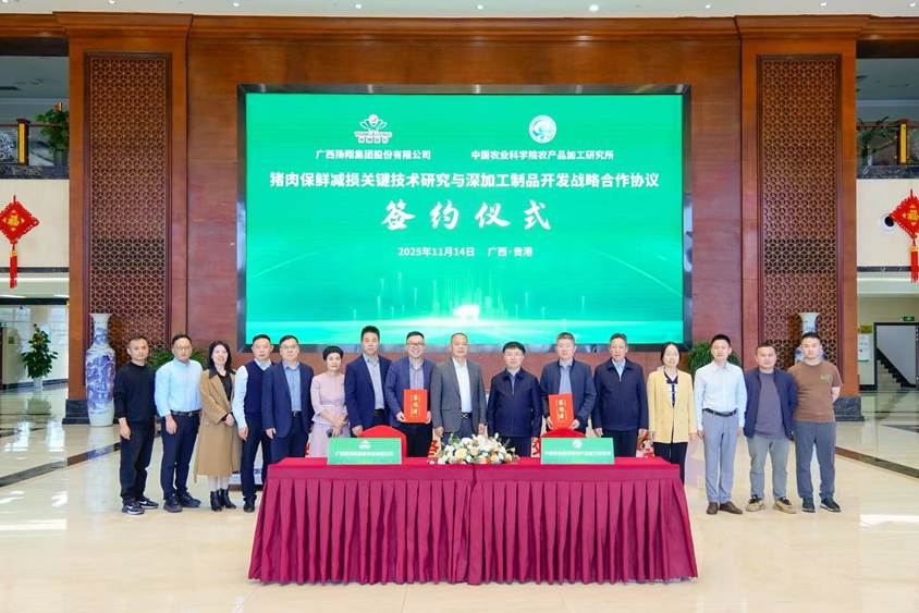 11月13-15日,加工所肉品科学与营养工程创新团队首席科学家张德权率队赴广西扬翔集团股份有限公司(以下简称“扬翔集团”)调研,双方就“猪肉保鲜减损关键技术研究与深加工制品开发”签署合作协议。